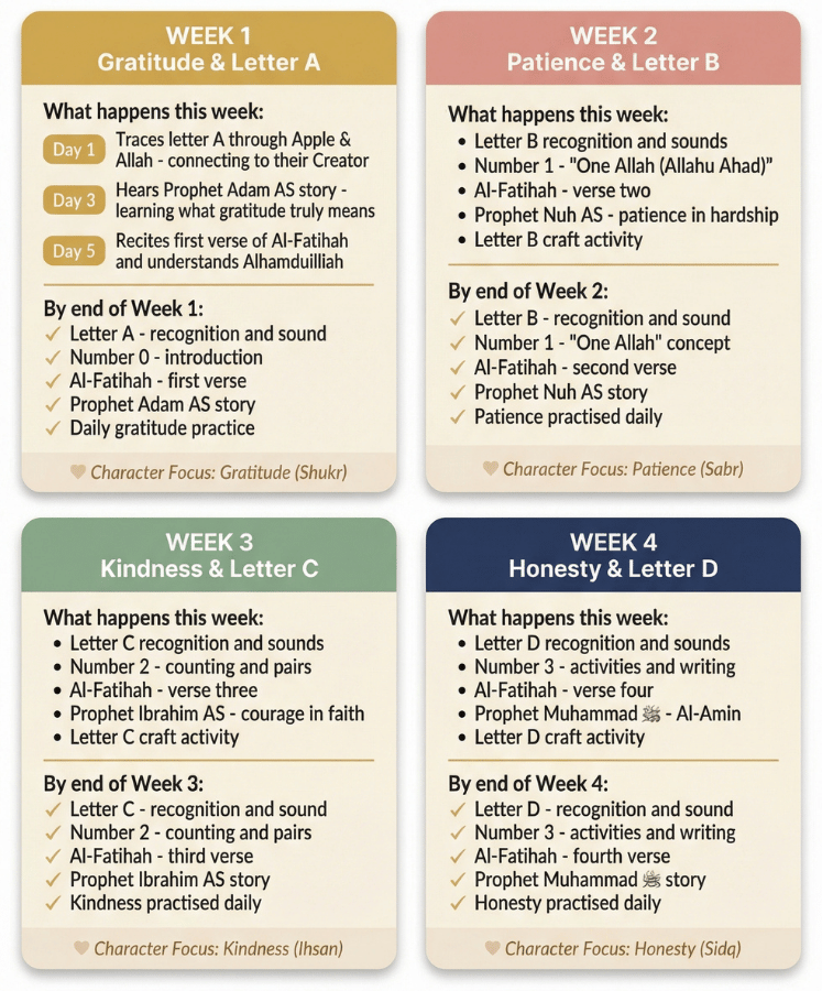 Islamic character lessons - Gratitude, Patience, Kindness, Honesty - woven through every week