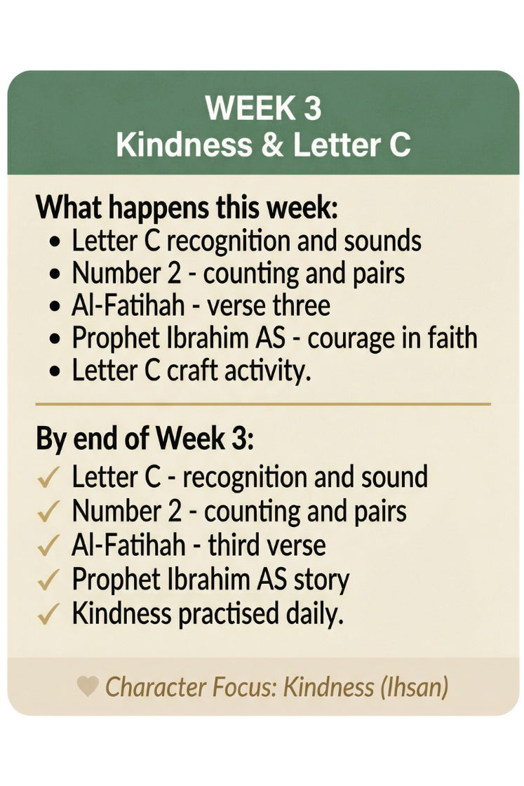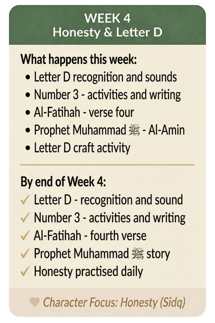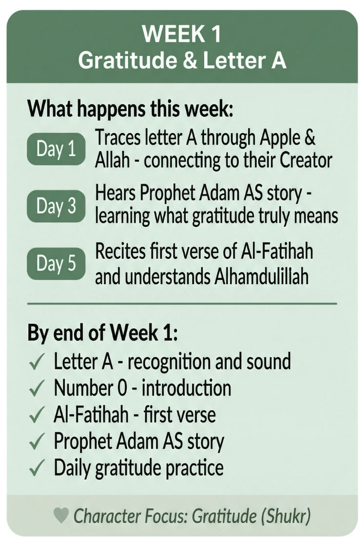 This is what makes this curriculum different from everything else you have tried. When your child counts to 5 they think of the five daily prayers. When they learn about honesty they learn it through Prophet Muhammad ﷺ. When they trace the letter A they connect it to Allah. Faith is not bolted onto academics - it is woven through them.
